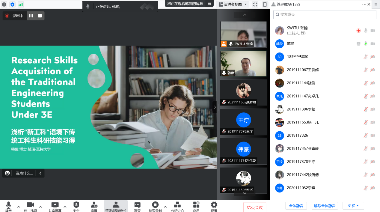 本门课程采用腾讯会议平台线上进行,共计747名本科生和研究生报名参加课程的学习,为全校报名人数第1的公司,每讲课程上线学习人数平均在200人左右。根据绝大多数员工课程总结可以看出,通过本门课程学习,了解机械工程相关的前沿方向以及可能遇到的挑战;大部分同学第一次听英文的课程,也是一种全新且奇妙的体验,也让同学们意识到学好英语的重要性,还意识到新兴的科学技术在机械工程学科中发挥重要作用等,对今后的学习和科研工作提供了很大的启发。