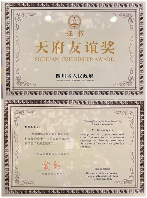 公司靳忠民教授获得2022年度“天府友谊奖”