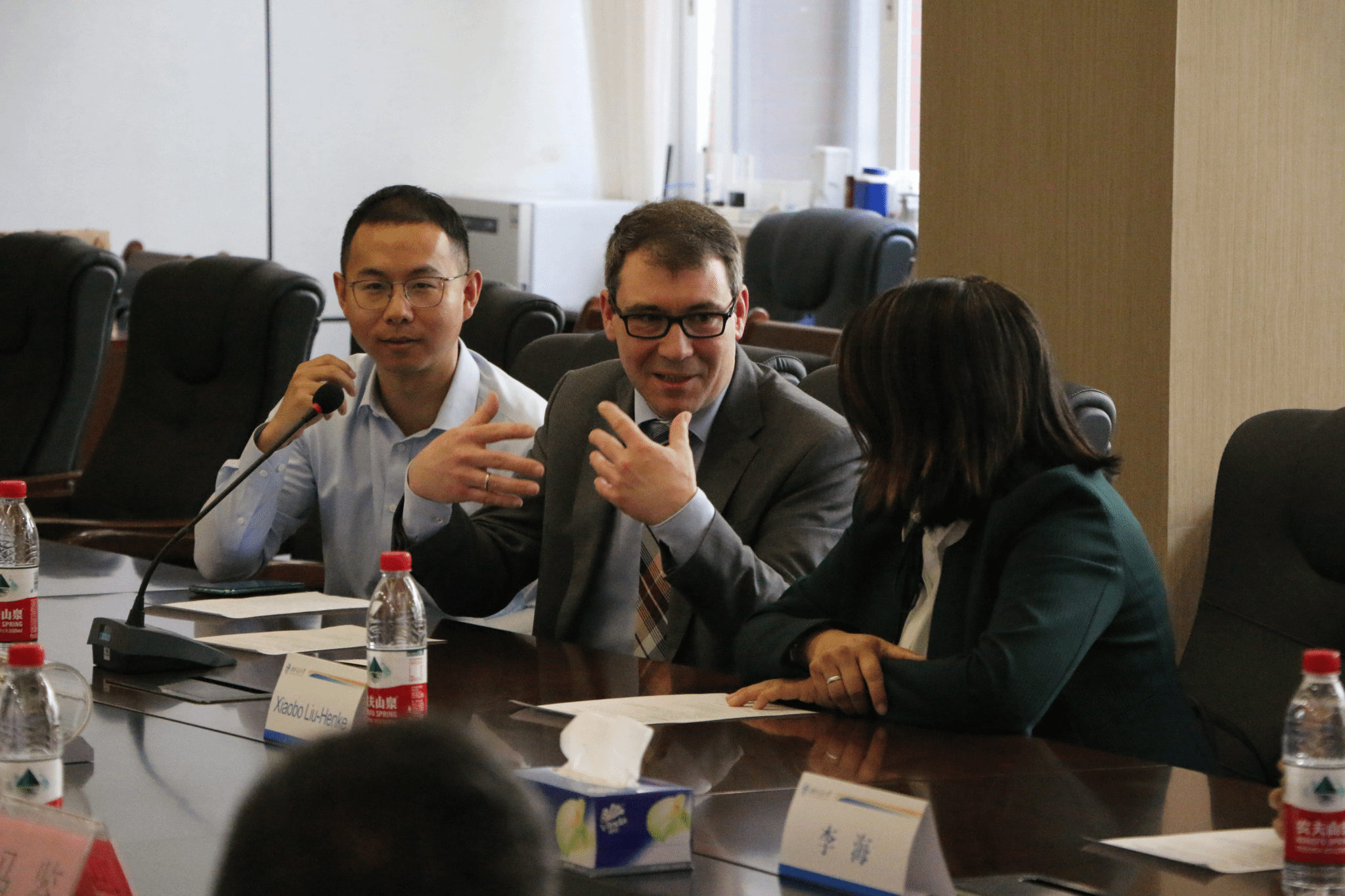 袁艳平书记对远道而来的奥斯特法利亚应用科学大学三亿经理Udo Triltsch教授、Xiaobo Liu-Henke教授致以诚挚问候和热烈欢迎,希望对方在接收公司研究生联合培养、科研合作等方面提供更多支持。