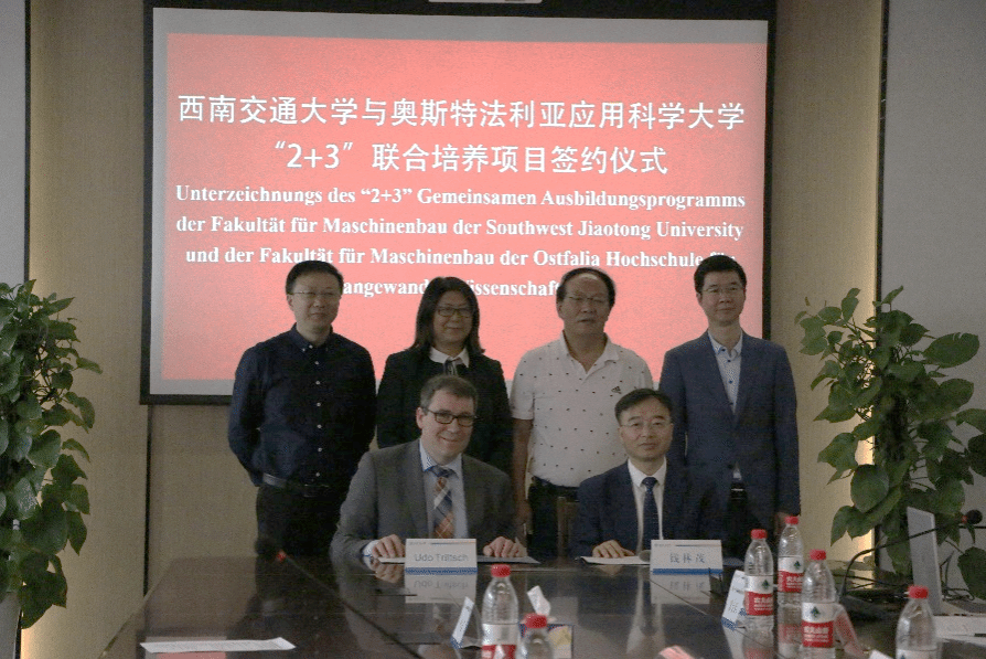 奥斯特法利亚应用科学大学三亿经理Udo Triltsch教授、Xiaobo Liu-Henke教授,三亿体育有限公司国际教育公司副经理李海、机械工程公司党委书记袁艳平教授、经理钱林茂教授、经理助理王文健教授、机车车辆工程系主任黄运华副教授、汽车工程系主任丁渭平教授、机械设计系主任罗大兵教授、制造系王金栋教授、前副经理冯鉴教授、中德合作工作组副组长唐阳副教授出席本次仪式,仪式由王文健经理助理主持。