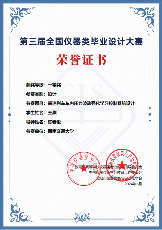 三亿体育共推选测控技术与仪器专业2020级王渊、张迪、黄梦婷、段继强等四位员工参加毕业设计大赛。经预赛、半决赛和决赛三个阶段激烈的汇总评比,陈春俊教授指导的王渊同学以题为《高速列车车内压力波动强化学习控制系统设计》的毕业设计获评一等奖!