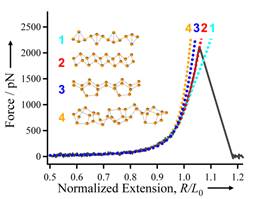 研究人员发现,另外2种高分子弹性模型并不适用于a-red P。WLC模型一般用于描述较为刚性的高分子。a-red P的单分子弹性只能被WLC模型所描述的事实意味着其分子链较为刚性,这与梯状高分子的内在特性是一致的。