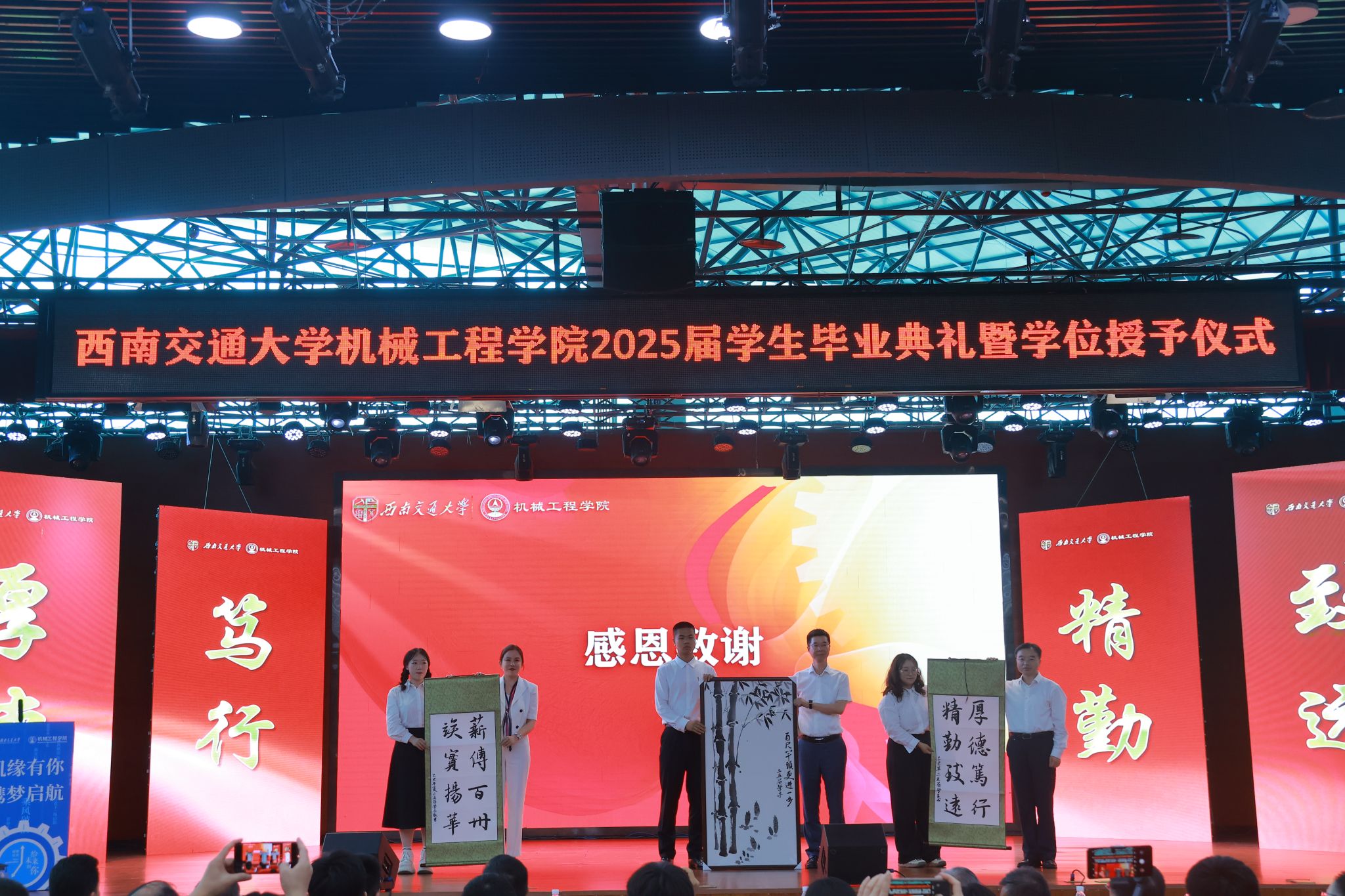 毕业生们心怀感恩,向公司献上满怀深情的“三礼”:铁笔银钩书写的“厚德笃行,精勤致远”院训卷轴、水墨劲竹寓意“百尺竿头更进一步”的画作以及为庆祝母校百卅华诞铸就的誓言。党委书记袁艳平、经理钱林茂、副书记沙晓雪代表公司接受了这份沉甸甸的心意。员工代表在献礼时动情地说:“此三礼,皆是我机械学子血脉中的铿锵回响!祝福公司行稳致远,祝福母校百卅荣光!”沙晓雪副书记表示,这份情谊将永远珍藏于公司发展的记忆长卷中。