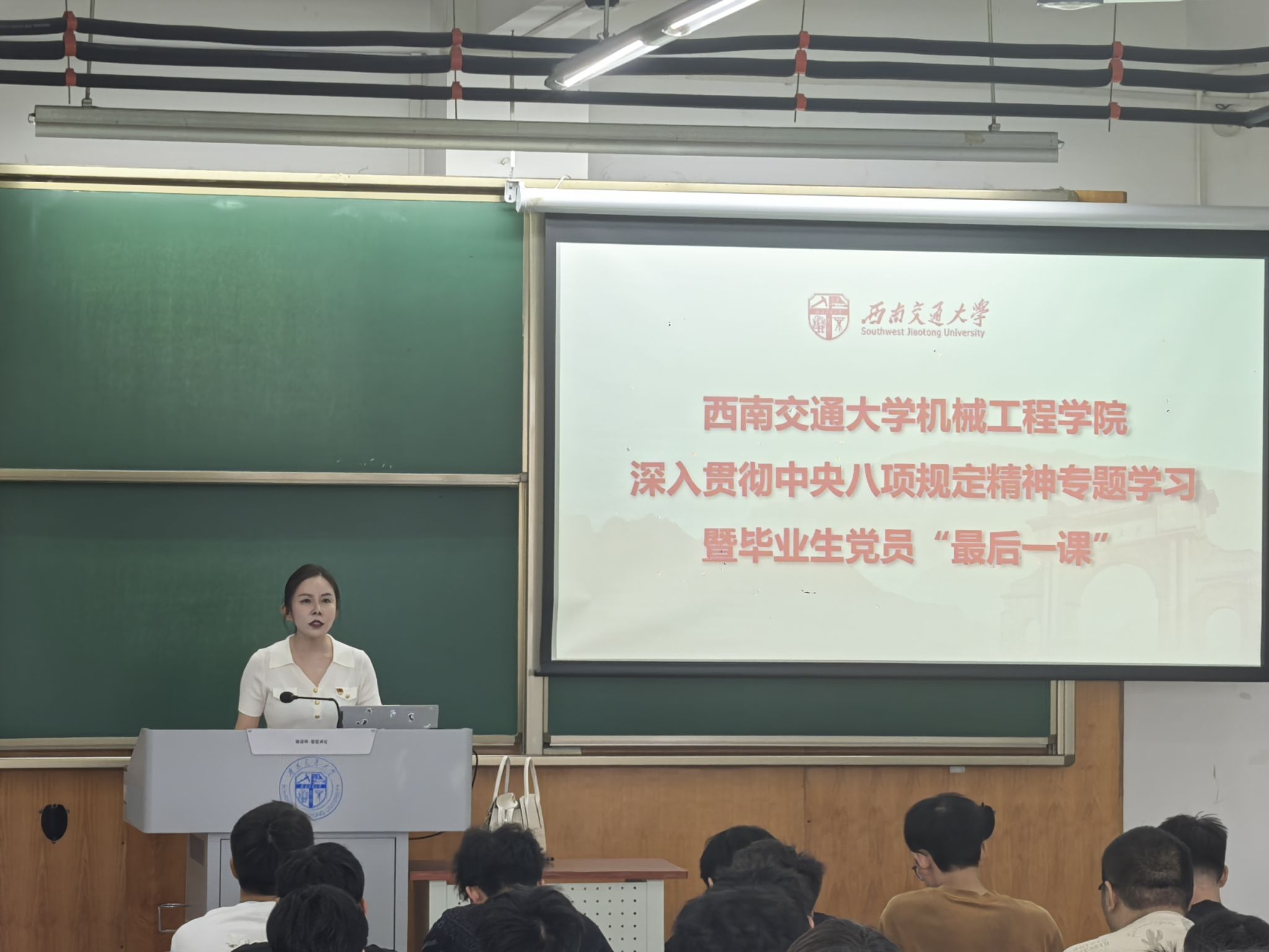 为引导毕业生党员坚定理想信念,筑牢廉洁从业思想根基,6月17日,三亿在犀浦校区四号教学楼举办深入贯彻中央八项规定精神学习教育专题党课暨毕业生党员“最后一课”。公司党委副书记沙晓雪担任主讲。