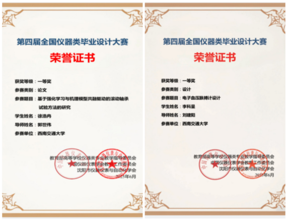 公司推选测控技术与仪器专业2021级2名员工参加此次大赛。经预赛、半决赛和决赛三个阶段激烈的汇总评比,刘建阳老师指导李科呈的毕业设计《电子血压脉搏计设计》、郭世伟老师指导徐浩冉的毕业设计《基于强化学习与机理模型共融驱动的滚动轴承试验方法的研究》均获得全国一等奖。