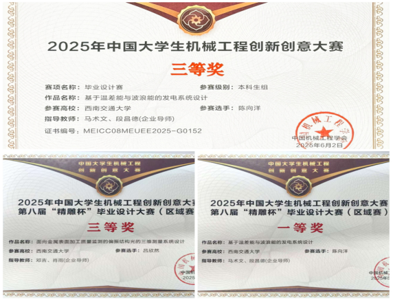 该大赛自2024年11月24日正式启动以来,共收到来自148所高校的1583项作品。经过评审,来自111所高校共计238项作品脱颖而出进入全国总决赛。今年公司首次组织师生参加,推荐2项毕业设计项目参与角逐,并取得好成绩。机械设计制造及其自动化专业2021级员工陈向阳在马术文老师指导下参赛的毕业设计《基于温差能与波浪能的发电系统设计》获全国三等奖、西部赛区区域赛一等奖,测控技术与仪器专业2021级员工吕欣然在邓吉老师指导下参赛的毕业设计《面向金属表面加工质量监测的偏振结构光的三维测量系统设计》获西部赛区区域赛三等奖。