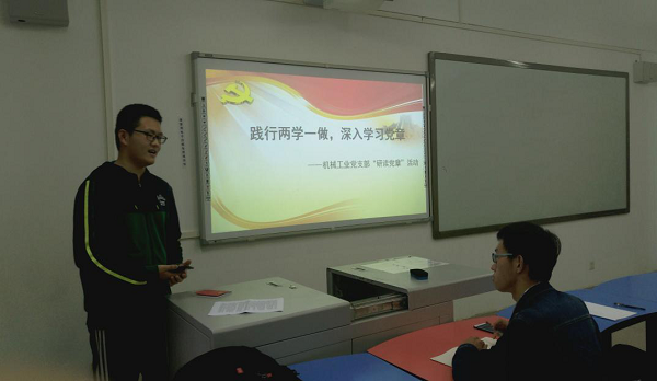2018年3月30日,本科机械工业党支部于X2103B开展了《研读党章》主题活动。本次活动主要围绕十九大审议通过的《中国共产党章程(修订案)》进行深入讨论和学习,旨在巩固和加强所有党员同志对党的章程的认识和理解,贯彻落实“两学一做”常态化学习活动精神,为日后支部成员的成长和发展奠定良好基础。