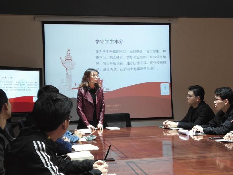 随后,团建中心各个部门部长就其中一点或两点,结合自身经历体会分别发言。强调了:1.员工干部与其他同学应为平等关系,应对其他同学有应有的尊重;2.员工干部应该培养自身的奋斗精神,提升自身道德素养;3.员工干部应该是校园风气与班级氛围的引导者,应该摒弃不良风气,起模范带头作用。