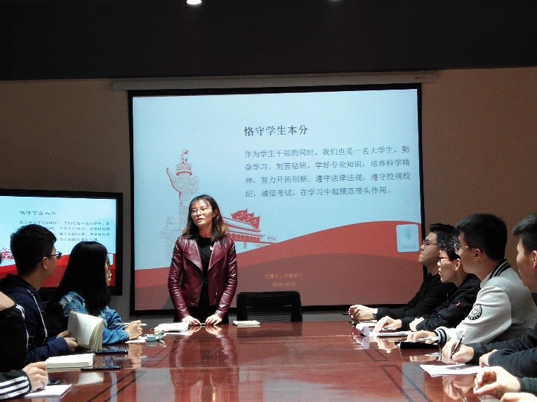 会议伊始,指导老师邓慧心带领大家朗读了员工干部作风相关守则,并就守则记录发表了自己的看法。邓慧心老师强调:“员工干部在大学中应以学习为主,应起模范带头作用,要树立为同学们服务的良好工作态度”。