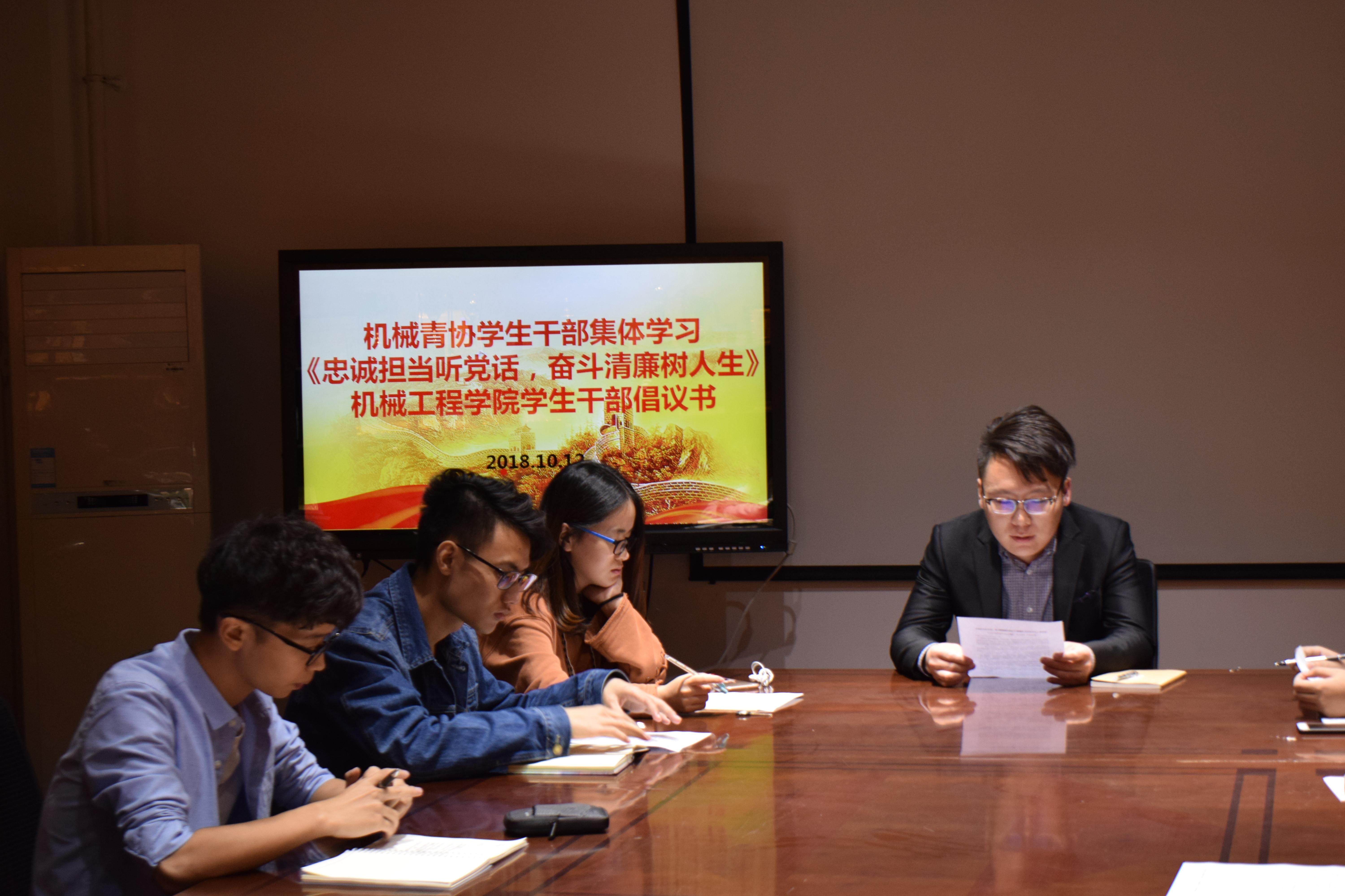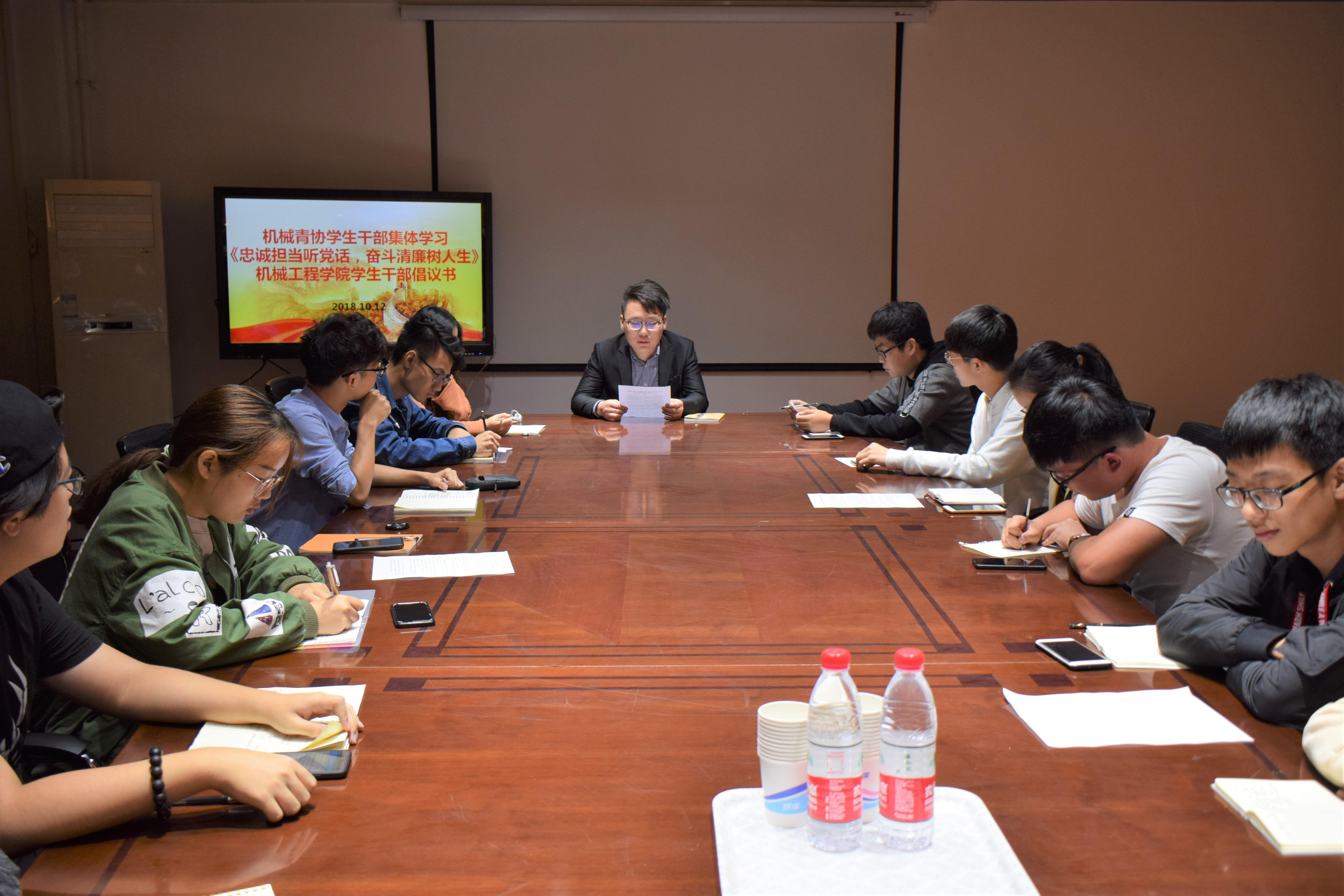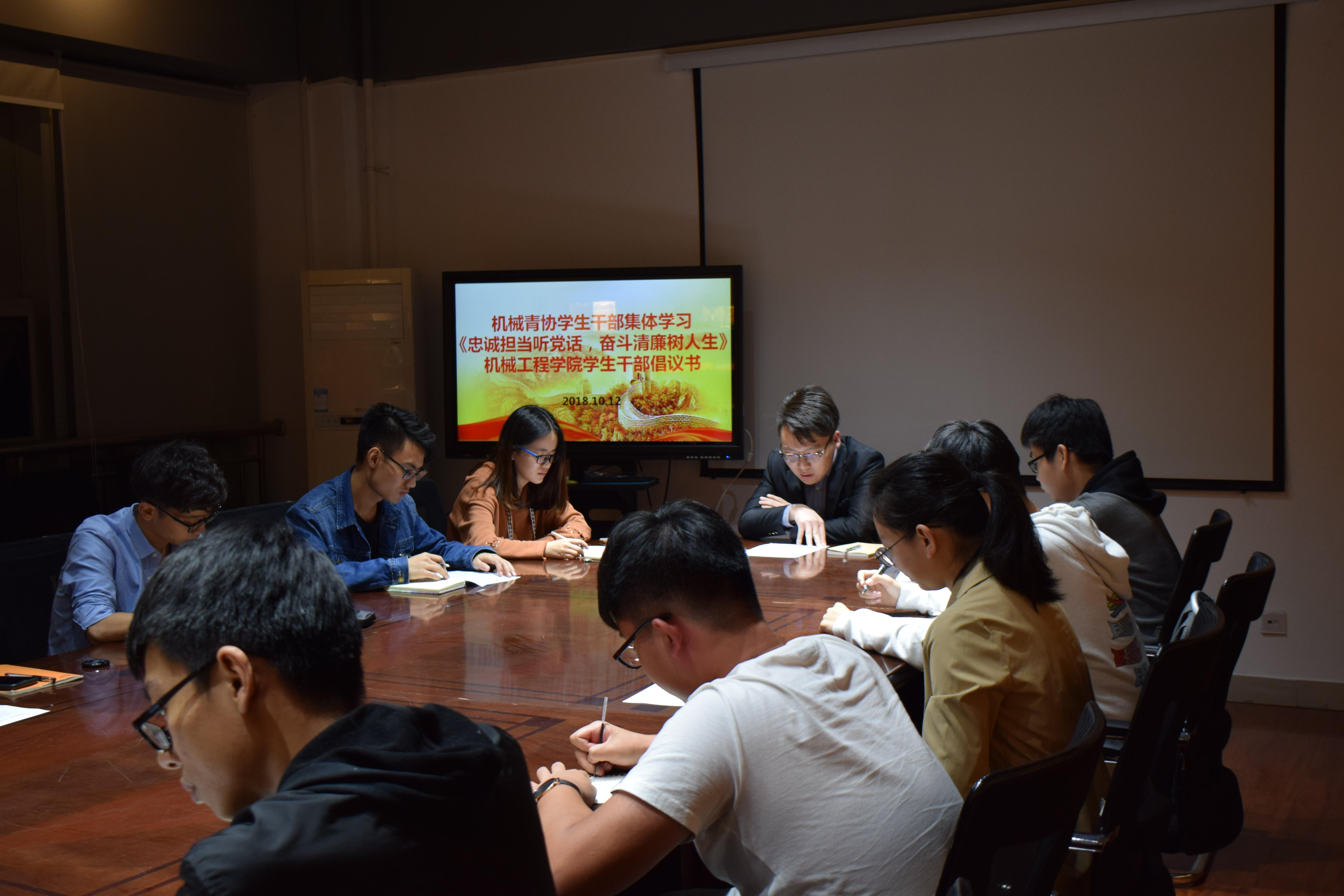 10月12日晚21:20三亿青年志愿者协会在X2201集体学习了《忠诚担当听党话,奋斗清廉树人生——三亿员工干部倡议书》。参与此次会议的有机械青协指导老师黄兆国,机械青协全体员工干部。本次学习会旨在端正员工干部的学习和工作态度,针对近期的某些高校员工组织官僚化的恶性事件进行自查,有则改之,无则加勉。