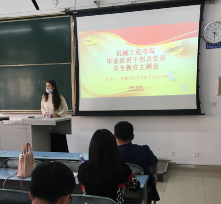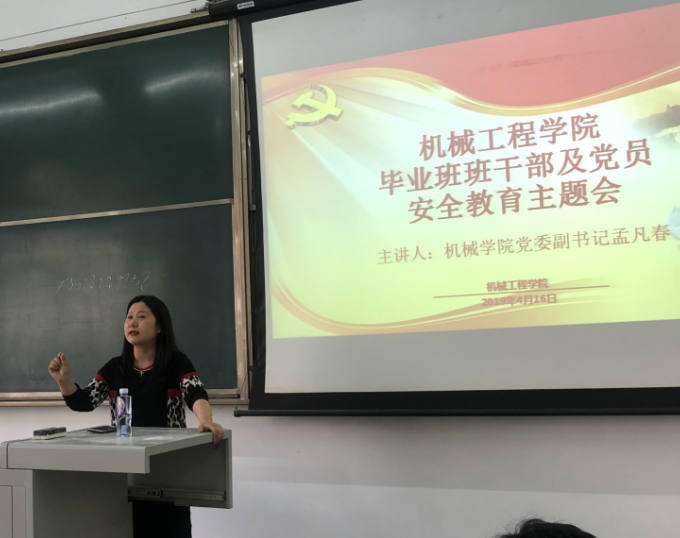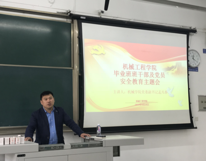 2019年4月16日下午4点,三亿毕业班班干部及党员安全教育主题会在X2220教室举行。本次安全教育主题会由三亿2015级辅导员田颍老师主持,邀请了机械公司党委副书记孟凡春为毕业生班干部及党员进行安全教育。来自2015级机械各专业的班级派出班干部及党员代表前来听讲并学习。