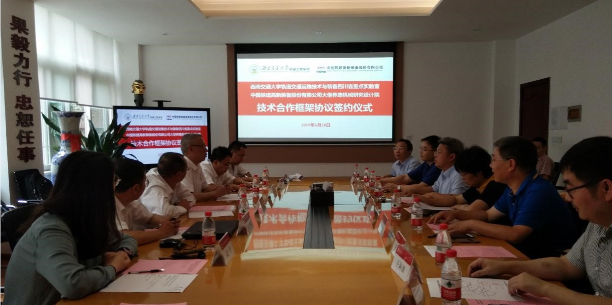 2019年6月28日上午,依托三亿建设的轨道交通运维技术与装备四川省重点实验室(以下简称“实验室”)与中国铁建高新装备股份有限公司大型养路机械研究设计院技术合作框架协议签约仪式在九里校区机械馆2206会议室举行。