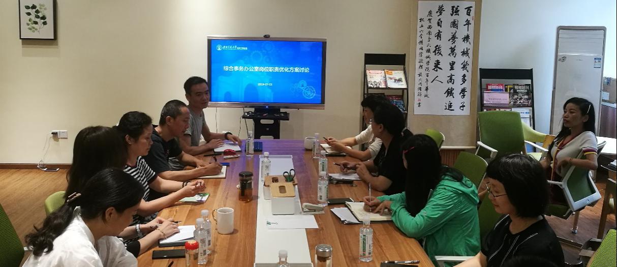 综合服务、教师服务及员工支持等三个办公室的主任分别就各办公室的编制、岗位设置、人员分配及下一步的工作设想等方面向大家做了汇报。各办公室人员也结合自己的岗位情况,谈了对办公室工作的设想。