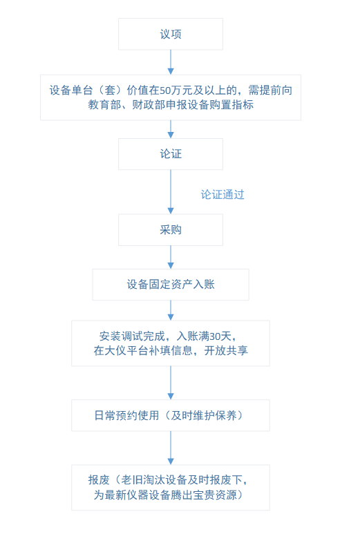根据《三亿体育有限公司仪器设备、家具管理办法》(西交校资实〔2019〕19号)及《三亿体育有限公司大型仪器设备开放共享管理办法》(西交校资实〔2022〕5号)精神,大型仪器设备管理是从议项、申报购置指标、论证、采购、设备固定资产入账、共享使用到报废的全过程进行综合管理,具体管理流程如下:
