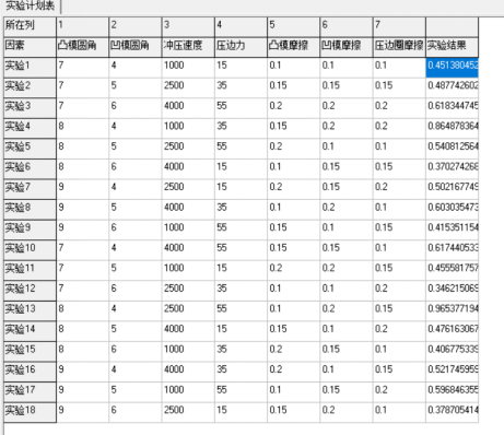 2、利用正交实验分析,在可能影响板料成形质量的多个潜在因素中,筛选出对板料成形质量影响显著性较大的若干个工艺参数(自变量),并利用拉丁超立方抽样,获取用于训练神经网络模型的样本。