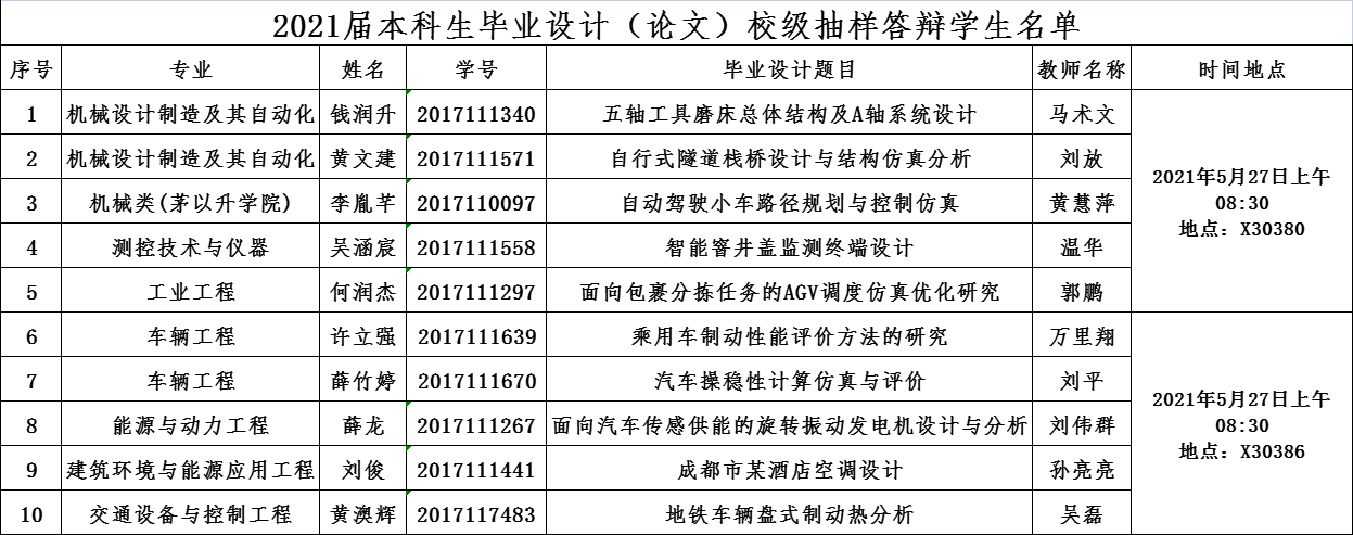 各系所完成答辩后,请于6月7日之前在教务网上提交成绩;机械、车辆专业请于6月6日之前将答辩成绩发送至jxbkjw@swjtu.edu.cn,公司将统一提交成绩。