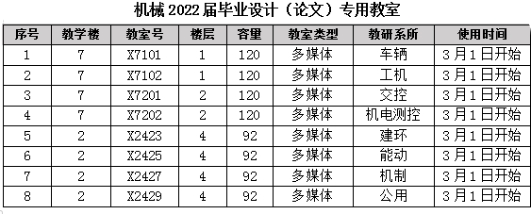 根据2022届毕业设计(论文)工作总体安排,公司为各公司配备了专用教室作为毕设(论文)指导和答疑专用场地,现将公司各教研室专业毕设(论文)指导和答疑专用场地安排如下: