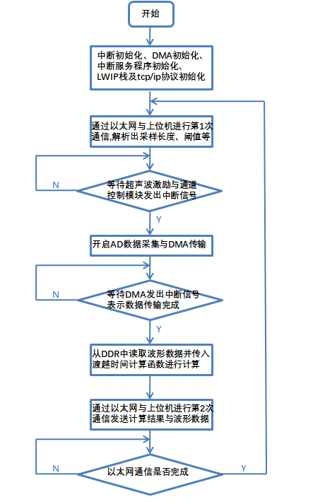 程序使用C语言进行编写,主要负责接收AD传来的数据,计算渡越时间,并将计算结果与其对应的波形数据发送至上位机。其中,接收AD传来的数据使用DMA的方式实现,将数据直接存入内存,不需要CPU一直控制。计算渡越时间使用电平比较法和最大峰值过零点法实现,编写了相应的程序。对于以太网数据传输,本系统采用TCP/IP协议作为网络通信协议,使用LWIP协议栈来实现。