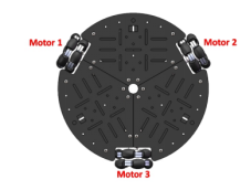 移动机器人平台已组装完毕:小A机器人使用3个均匀分布夹角为120°的全向轮来实现平面内的全向移动,三个全向轮同时接触地面,如图1所示。为了保证全向底盘能够由足够的驱动性,在底盘上配备了三个独立的电机,电机为直流减速电机并带有编码器。通过联轴器与全向轮连接,呈三角形分布,如图2所示。