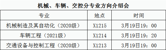专业介绍会后,按班级填写《三亿专业方向选择志愿表》,并于3月28日上午10点之前将纸质表交至辅导员办公室(2020级交X2203、2021级交X2205),电子稿2020级发送至jiaodajixie2020@126.com,2021级jxxy20212021@163.com,发送至邮件标题为机械/车辆/交控2020、2021-0*班分专业方向志愿表。