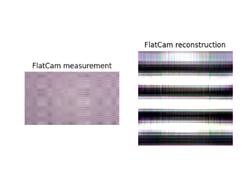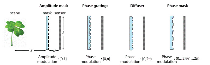 FlatCam 是一款新型的无镜头相机,相机由振幅掩膜板以及一个 RGB 光学传感器叠加组成,场景反射光通过掩膜板后在传感器上形成由多个小孔成像叠加后的图案。