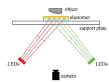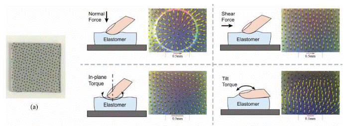 Gel-Sight传感器是一种基于光学原理的触觉统称。该传感器以弹性体作为接触介质,通过内嵌相机捕捉与物后发生的变形。弹性体表面涂有光反射层,并经过多种颜色共同照由此可依据计算机视觉从相图像中重建接触面的高分辨率三维几何形状。传感器表面存在标记点,其运动可以提供法向和剪切力信息。