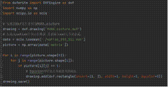 进行光刻加工需要使用掩模板图案的dxf文件。本小组将含有矩阵信息的mat文件从 MATLAB 中导出,利用Python的dxfwriter库实现了dxf文件的自动生成。