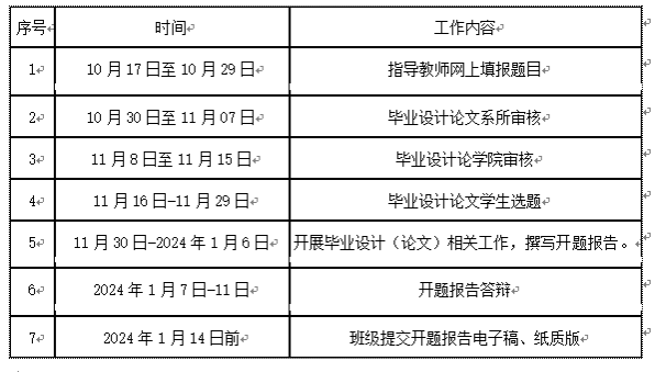 开题报告检查与答辩时间:采用各教研室普查,公司抽查的方式进行,公司抽查名单在12月公布,各系所2024年1月7日—1月11日安排开题报告答辩,具体答辩信息另行通知。