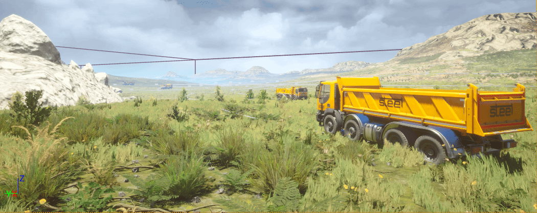 仿真环境中主要涉及卡车模型的建模、场景的建模、卡车路径的规划以及卡车沿预定轨迹运行的控制算法。其中卡车模型与场景模型直接使用开源模型,并对其各个部分针对本设计进行专门的修改,场景中共有10辆卡车,通过简单的控制算法(即偏离预定轨迹后通过方向盘偏转进行修正,本设计中控制不占主要地位,此处未设置反馈控制)对卡车的运动进行控制。