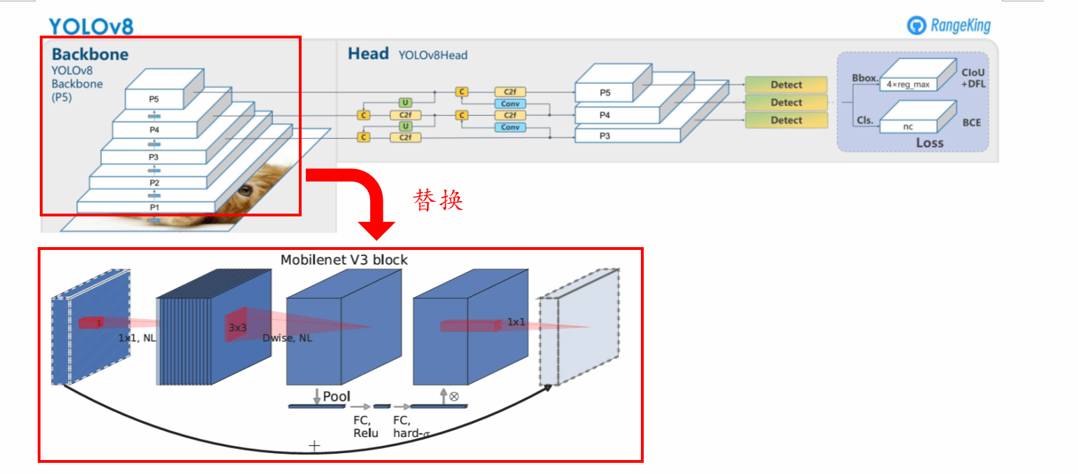 图3 YOLOv8模型主干及MobileNetv3网络模块