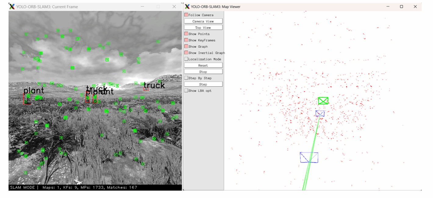 图6 ORB-SLAM3运行过程图(左:特征点提取位置 右:位置估计)