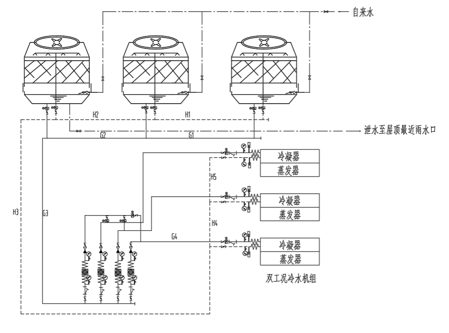 为节约能量和水资源,降低运行费用,本设计采用闭式循环冷却水系统。选用冷却水泵 3 台,三台冷却塔并联运行,与冷水机组一一对应,放置于12层屋顶,冷却水管布置在西侧管井内。