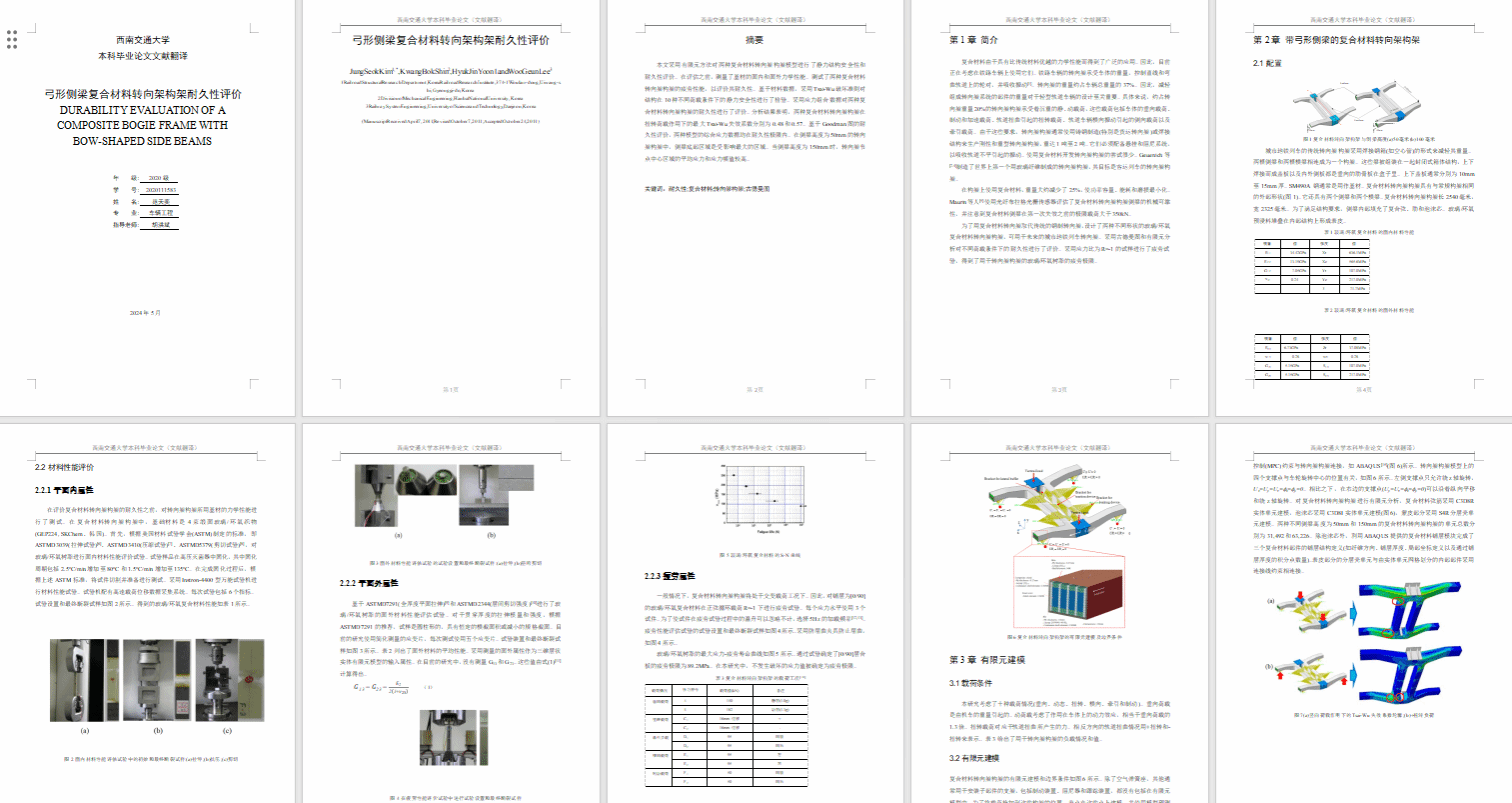 1. 查阅和归纳整理有关复合材料方面的文献,了解复合材料在轨道交通方面国内外发展现状,掌握复合材料力学基础,完成了外文文献翻译工作以及论文绪论部分的撰写工作。