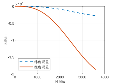 结果分析:图2中数据是将经度误差与地球半径相乘,转换成单位为m的东向位置误差;同理将纬度误差转换成单位为m的北向位置误差。静态导航仿真1小时后,末点位置误差约为,与理论相符,可验证惯导解算算法的正确性,同时由图2也可看出,惯性导航解算具有发散性,需要引入组合导航以获得更高的精度。