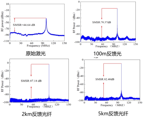 较高的边模抑制比意味着主模的功率与辅助模的功率差别更大,激光器的输出更稳定,辅助模对主模的影响更小。一般来说,边模抑制比应该大于40dB,较高的数值表示激光器性能更好。而此次未进行压缩的激光边模抑制比SMSR为:44.64dB。添加反馈结构后边模抑制比有了较大的提升,其中在2km长反馈光纤中,边模抑制比达到了87.18dB几乎是未加反馈的两倍,效果很好。