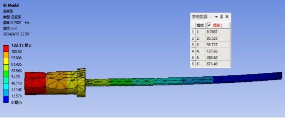 3.根据3D打印材料属性对叶片模型进行ANSYS模态分析,得到叶片模型固有频率;