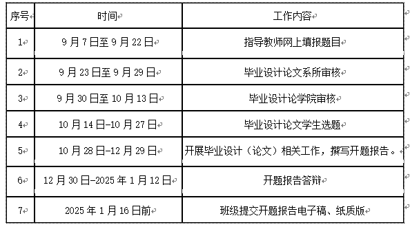 开题报告检查与答辩时间:采用各教研室普查,公司抽查的方式进行,公司抽查名单在12月公布,各系所2024年12月30日—2025年1月12日安排开题报告答辩,具体答辩信息另行通知。