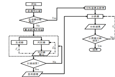 设计的CGAN模型训练过程分为两个步骤,首先训练生成器和判别器,再训练分类器。由于在训练初期生成器性能较差,生成样本很容易被判别器“识破”,所以在交替训练生成器和判别器时一般训练生成器k次,训练判别器一次。在训练生成器时,随机产生噪声以及条件信息y,输入到生成器中得到生成样本,再将输入到判别器中得到判别器输出,根据判别器输出以及上述损失函数对生成器进行网络参数更新;在训练判别器时,通过对比其输出结果与条件信息的误差更新网络参数。当生成器和判别器完成训练后,将生成样本和真实数据中的训练数据共同作为分类器的训练样本。