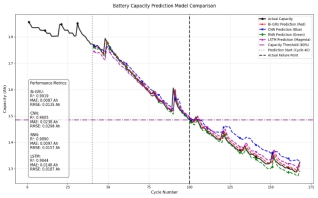 (4)Bi-GRU与RNN、LSTM、CNN的性能对比分析:对比Bi-GRU、RNN、LSTM和CNN在锂电池RUL预测中的表现,分析不同模型的优劣,从而验证Bi-GRU的效果,确保所选模型的优越性。