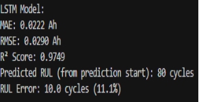 在设定的预测起点开始预测,拟合程度较高,MAE,RMSE较小,R²接近1,说明拟合程度高,同时计算出来的RUL误差只有1.6%,说明模型的可靠度较高。