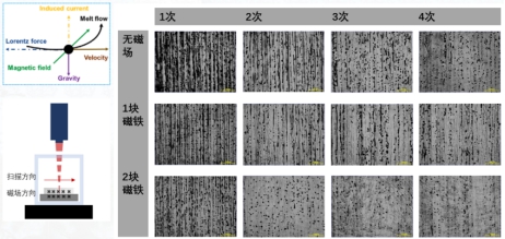 回答:液体在磁场中流动时会受到与速度方向相反的洛伦兹力,其作为阻尼力可以一定程度上抑制熔池的过流现象,通过减少流动速度来减少液体的溢出,进而在熔池凝固后得到更好的表面。