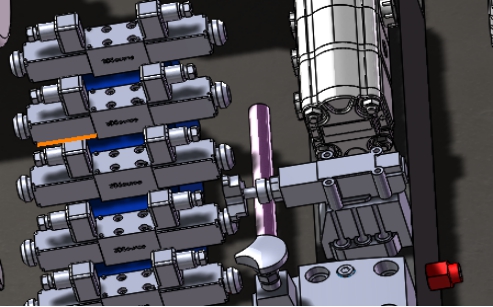b) 对液压系统进行三维建模(液压阀,管路等)
