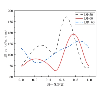 在断裂力学当中,我们通常使用应力强度因子来量化裂纹尖端的应力场强度,并根据裂纹类型(张开型裂纹、划开型裂纹、撕开型裂纹)的不同,分为了KI、KII、KIII三种类型。而等效强度因子ΔKeq,是综合KI、KII、KIII等效出来的反应裂纹扩展的驱动力。