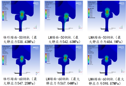 (3)导入ANSYS当中进行前处理。对于钢轨,对钢轨底面进行全约束,两侧面对称约束。对于车轮,采用主从节点耦合的方式,控制轮毂孔内表面的节点自由度,对于约束车轮中心主节点X、Z方向平动位移,Y、Z方向转动位移,轴重施加在远程点上;除此而外,还应完成材料属性定义、接触设置、分析设置等一系列前处理操作。最后并得到仿真结果,并对ANSYS仿真数据后处理。