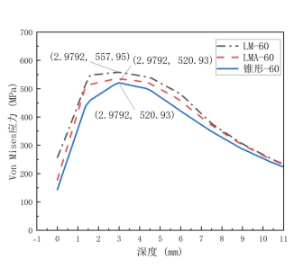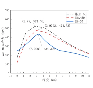 图 7 Von Mises应力沿钢轨踏面深度分布