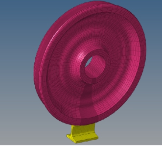(2)因为Hypermesh出众的网格划分能力,同时为了兼顾求解精度与效率。根据圣维南原理,在Hypermesh中,对轮轨接触部分网格采取细化,而对于其余部分网格粗化。具体步骤为:选取车轮截面,在车轮接触点为中心,根据接触钢轨横截面的情况,向车轮内外侧扩展一定距离,向车轮径向扩展24mm。此处区域网格尺寸为1.5×1.5mm的面网格。车轮横截面其他区域,则逐步扩大网格尺寸,依次为1.5、3、5、10。最后,以车轴为旋转中心,进行旋转,得到实体网格。钢轨的网格划分方法类似。