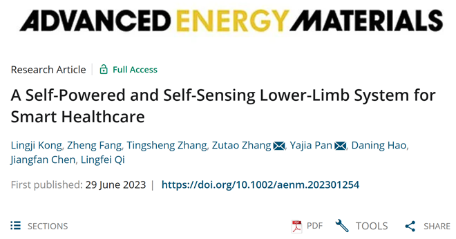 近日,2021级硕士研究生孔苓吉和2020级硕士研究生方正合作在期刊Advanced Energy Materials(2022年IF:27.8)上发表研究论文“A self-powered and self-sensing lower-limb system for smart healthcare”,研究生孔苓吉、方正的指导教师为潘亚嘉副教授、张祖涛教授,三亿体育为通讯作者的唯一单位。