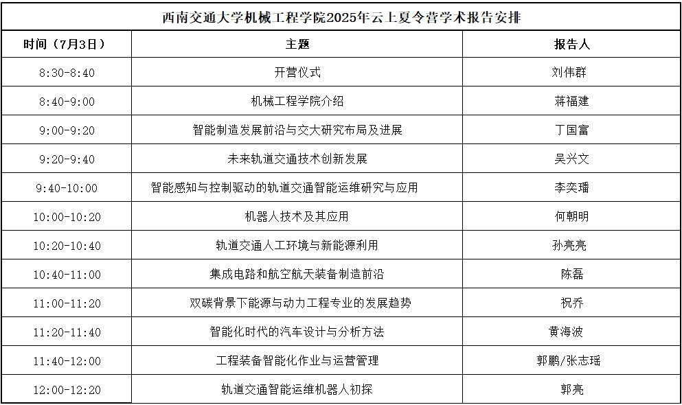 2025年云上学术夏令营活动将通过线上举行,请报名参加的同学及时加入通知QQ群:901029991。活动时间为7月3日全天,分2个阶段进行,具体安排如下: